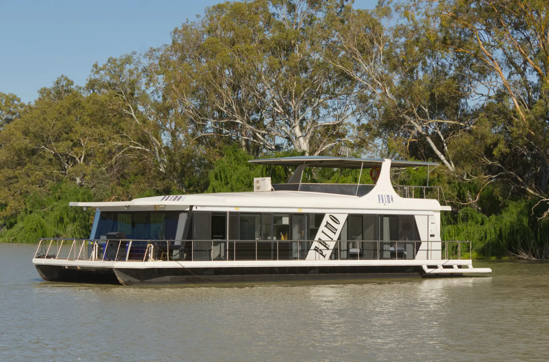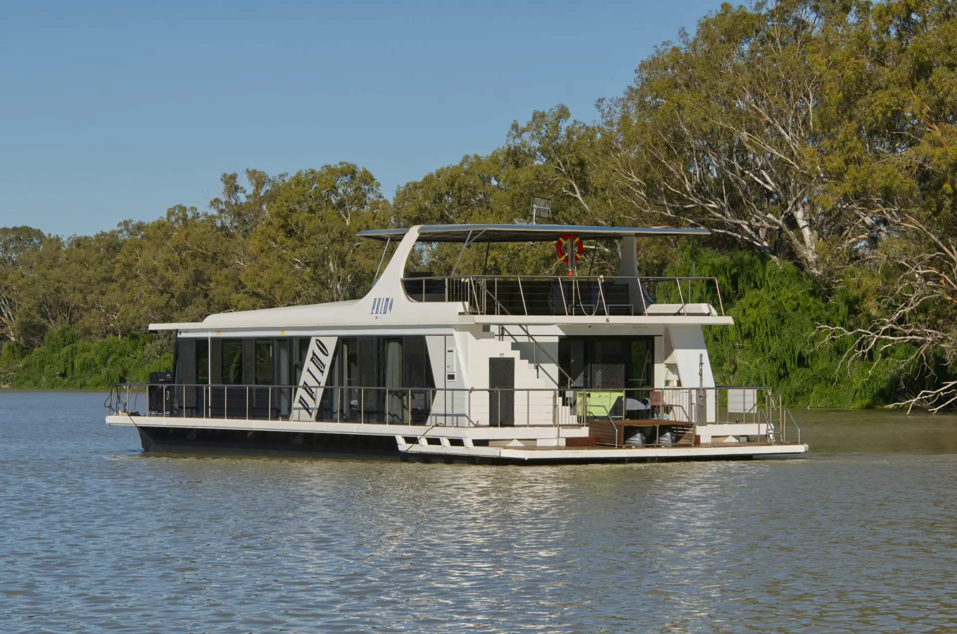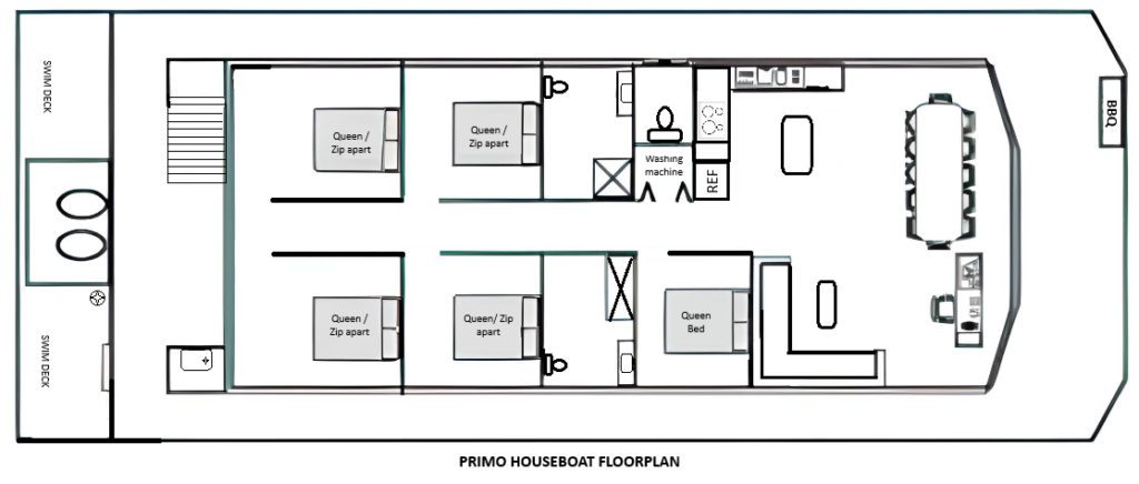 Primo is a pet-friendly houseboat that accommodates 10-12 guests. It offers 5 queen bedrooms (4 can be configured as twin-share). The front lounge includes a sofa bed for extra sleeping space if needed. Primo has a large upper deck for entertaining.