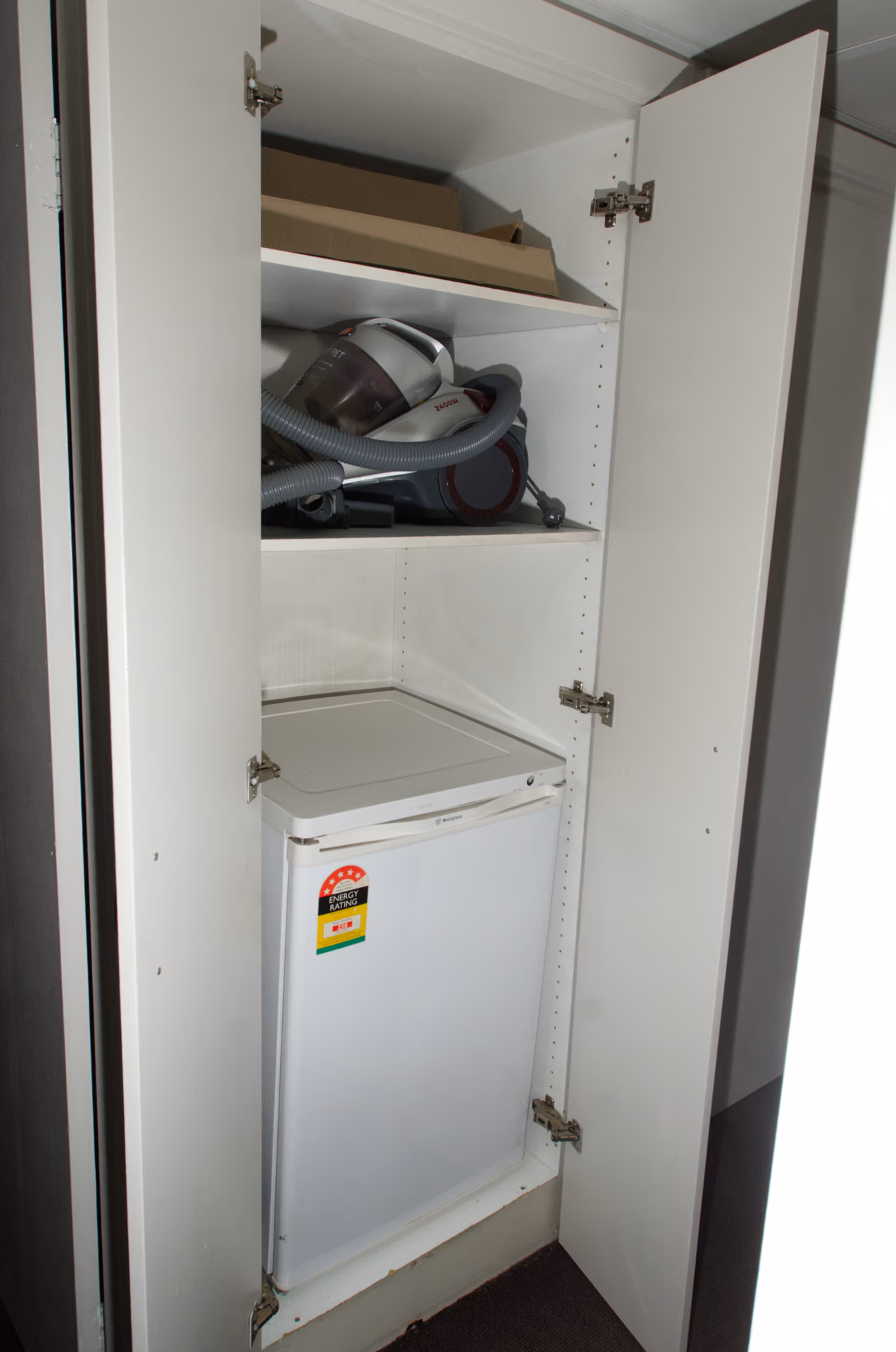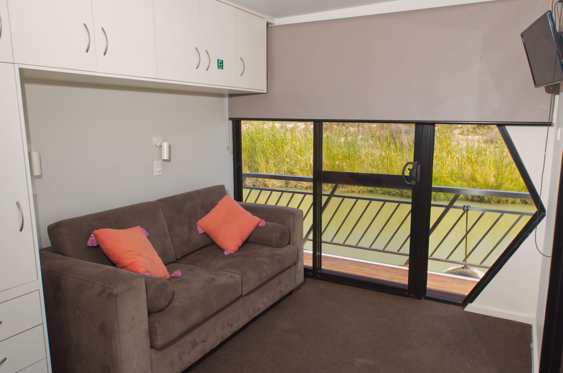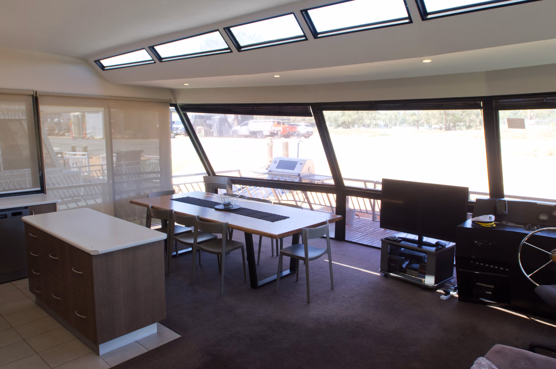 The shaded top deck is accessed by a fully carpeted stairway and features a large gas heated spa. The spacious 10-12 person table is ideal for outdoor meals or evening gatherings, and there’s another esky for added convenience.