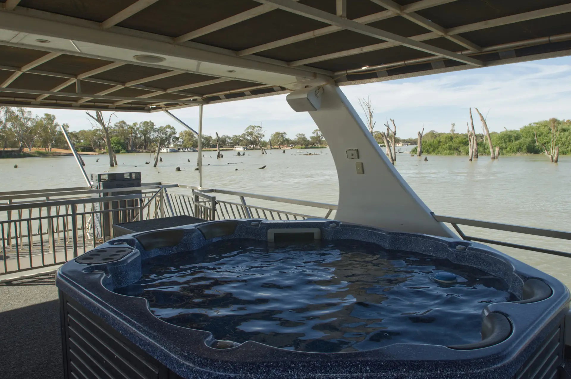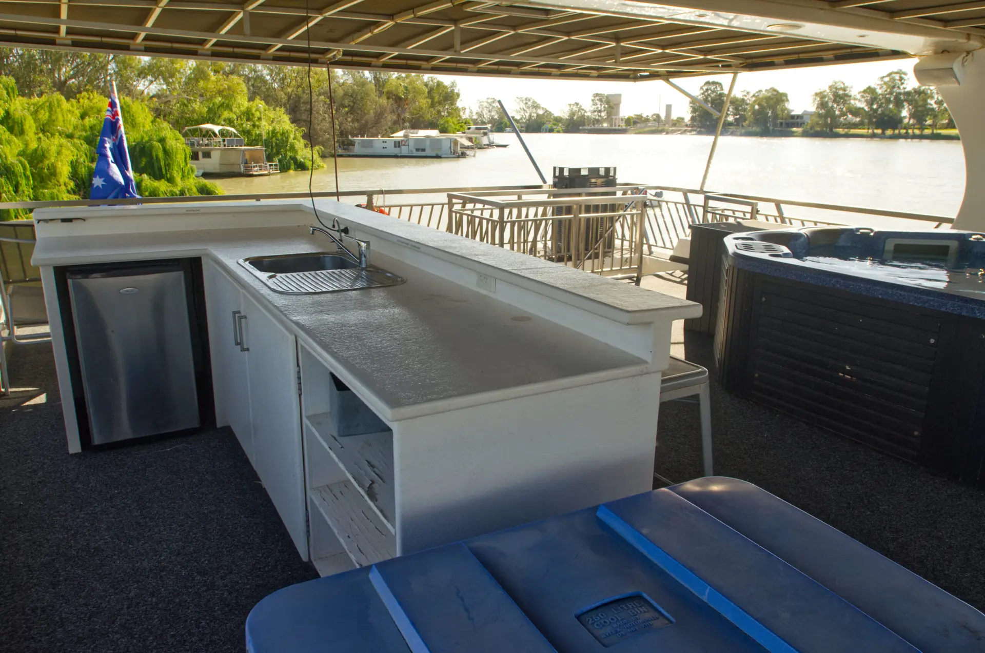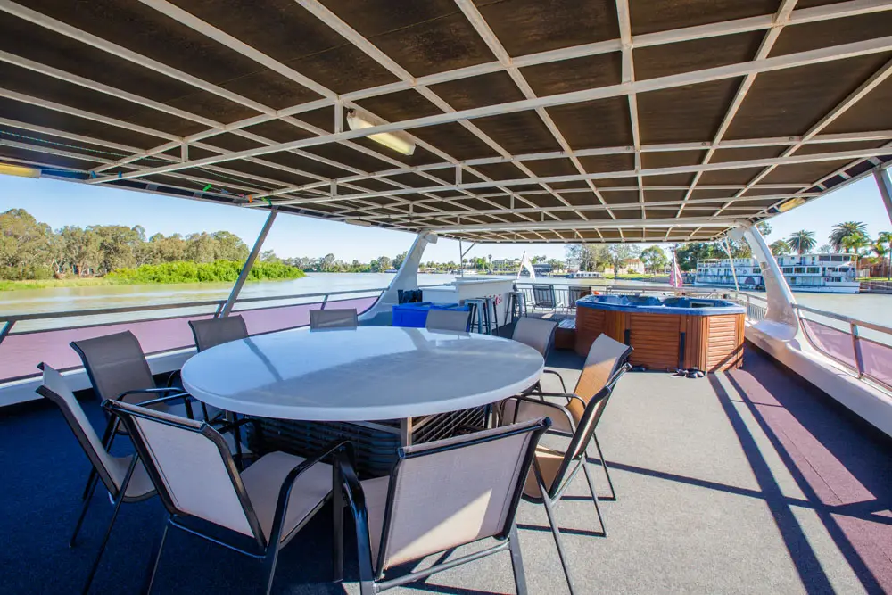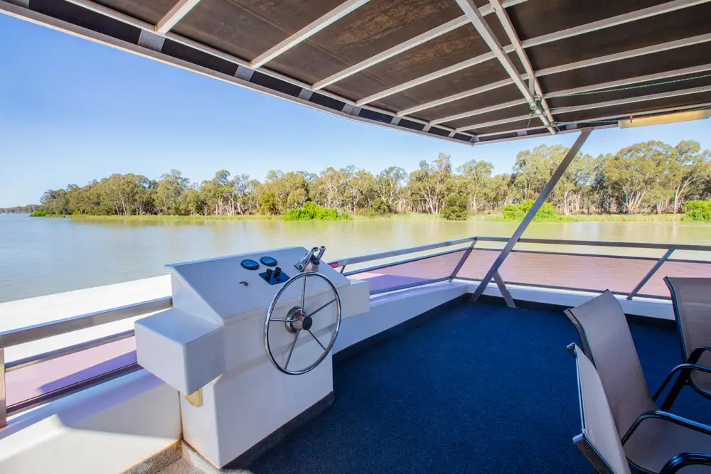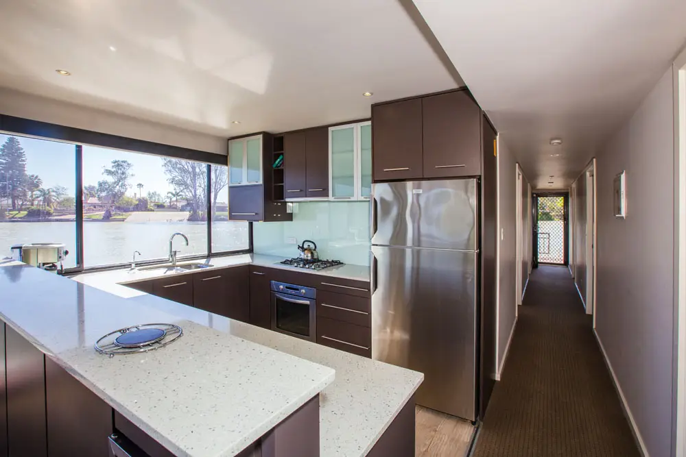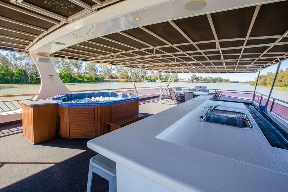 Take in the stunning views from the top deck, relax in the spa, or enjoy a drink at the cocktail bar. Inside, catch a movie on the 42″ wall-mounted TV, or head to the back deck for a spot of fishing or water skiing on the Mighty Murray River.